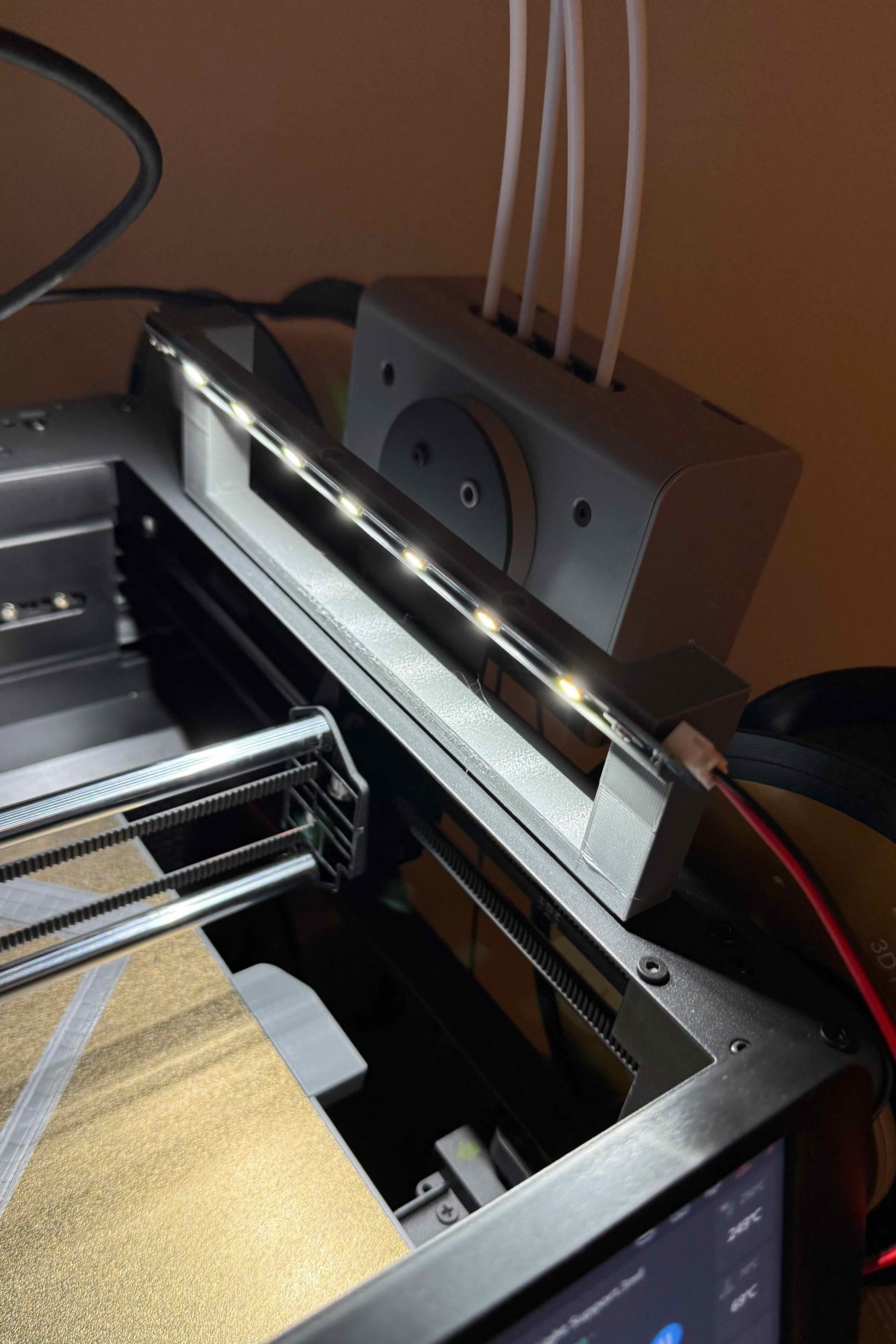 I realized that the standard LED holder for the FlashForge AD5X did not have enough clearance for the printhead, so I created a new brace that puts it above the Printhead.  Designed in Thinkercad